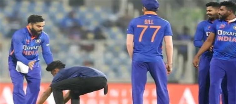 సాధారణంగా స్టేడియంలో ఉన్న ప్రేక్షకులు మైదానంలోకి దూసుకు రాకుండా ఉండడానికి స్టేడియం చుట్టూ ఎంతోమంది సెక్యూరిటీ సిబ్బంది ఉంటారు. కానీ కొన్ని కొన్ని సార్లు అభిమానులు మాత్రం కాస్త అత్యుత్సాహాన్ని ప్రదర్శిస్తూ ఉంటారు. ఏకంగా స్టేడియంలో ఉన్న సెక్యూరిటీ సిబ్బందిని దాటుకుని తమ అభిమాన క్రికెటర్లను కలిసేందుకు మైదానంలోకి దూసుకు రావడం లాంటి ఘటనలు ఇప్పటివరకు ఎన్నోసార్లు జరిగాయి. ఇక కరోనా వైరస్ వెలుగులోకి వచ్చిన తర్వాత మాత్రం ఇలాంటి తరహా ఘటనలు కాస్త తగ్గుముఖం పట్టాయి అని చెప్పాలి. ఇకపోతే శ్రీలంకతో భారత్ వేదికగా జరిగిన మూడో వన్డే మ్యాచ్లో కూడా ఇలాంటి తరహా ఘటన జరిగింది.