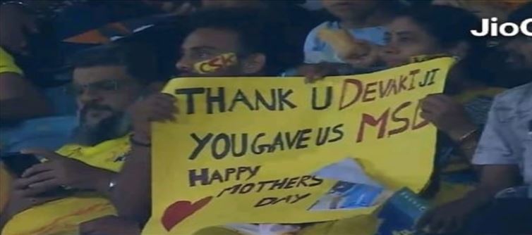 ఇప్పుడు ఒక అభిమాని ఏకంగా మహేంద్ర సింగ్ ధోనీకి కాదు ఆయనను కన్న తల్లికి కృతజ్ఞతలు తెలిపారు. ఇటీవల మదర్స్ డే కావడం.. అదే రోజు చెన్నైలోనే చపాక్ స్టేడియం వేదికగా మహేంద్రసింగ్ ధోని మ్యాచ్ ఆడటంతో ఒక అభిమాని ఆసక్తికర ఫ్లకార్డుని ప్రదర్శించింది. ధోని తల్లికి శుభాకాంక్షలు చెబుతూ థాంక్స్ దేవకి గారు.. మీరు మాకు ధోనినీ ఇచ్చారు. హ్యాపీ మదర్స్ డే అని రాసిన ఫ్లకార్డు ప్రదర్శించగా ఇక ఈ ప్లకార్డు అటు ధోని అభిమానులు అందరిని కూడా విశేషంగా ఆకట్టుకుంటుంది.
