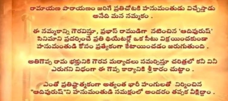 ఇక ఈ ప్రకటన ప్రతి ఒక్కరిని కూడా ఫిదా చేస్తుంది అని చెప్పాలి. ఆదిపురుష్ సినిమాను ప్రదర్శించే ప్రతి థియేటర్లో ఒక సీటును విక్రయించకుండా హనుమంతుడి కోసం ప్రత్యేకంగా కేటాయించినట్లు చిత్ర బృందం ఇటీవల ప్రకటించింది. రామాయణం పారాయణం జరిగే ప్రతి చోటికి రామ భక్తుడు హనుమంతుడు విచ్చేస్తాడని మన నమ్మకం. ఈ నమ్మకాన్ని గౌరవిస్తూ ప్రతి థియేటర్లో ఒక సీటును హనుమంతుడు కోసం కేటాయిస్తాం అంటూ ఒక ప్రకటన చేసింది. ప్రతి ఒక్కరం హనుమంతుడితో కలిసి ఆదిపురుష్ సినిమా వీక్షిద్దాం అంటూ చిత్ర బృందం తెలిపింది.