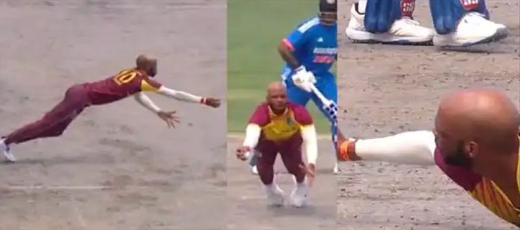 ఈ క్రమంలోనే తిలక్ దూకుడు కి అడ్డుకట్ట వేసేందుకు వెస్టిండీస్ కెప్టెన్ స్పిన్నర్స్ ఛేజ్ ను తీసుకువచ్చాడు. అయితే ఇక కెప్టెన్ రోవ్ మన్ పావల్ నమ్మకాన్ని ఛేజ్ వమ్ము చేయలేదు. తన తొలి ఓవర్ లోనే సంచలన ఫామ్ లో ఉన్న తిలక్ వర్మను పెవిలియన్ పంపించడంలో సక్సెస్ అయ్యాడు. ఏడవ ఓవర్ వేసిన ఛేజ్ బౌలింగ్ లో తిలక్ వర్మ లాంగ్ ఆఫ్ దిశగా ఆడెందుకు ప్రయత్నించాడు. ఈ క్రమంలోనే చేజ్ అద్భుతంగా డైవ్ చేస్తూ రిటర్న్ క్యాచ్ అందుకున్నాడు అయితే అది బంప్ బాల్ అనే అందరూ అనుకున్నారు. కానీ ఫీల్ ఎంపైర్లు థర్డ్ అంపైర్ కు రిపర్ చేయగా రిప్లై లో బంతి బ్యాట్ కు తాకి నేరుగా చేతుల్లోకి వెళ్లినట్లు తేలింది. దీంతో 27 పరుగుల వద్ద తిలక్ వర్మ నిరాశతో మైదానాన్ని పెట్టాడు. అయితే ఛేజ్ పట్టిన క్యాచ్ తో తిలక్ వర్మ ఒక్కసారిగా షాక్ లో మునిగిపోయాడు.