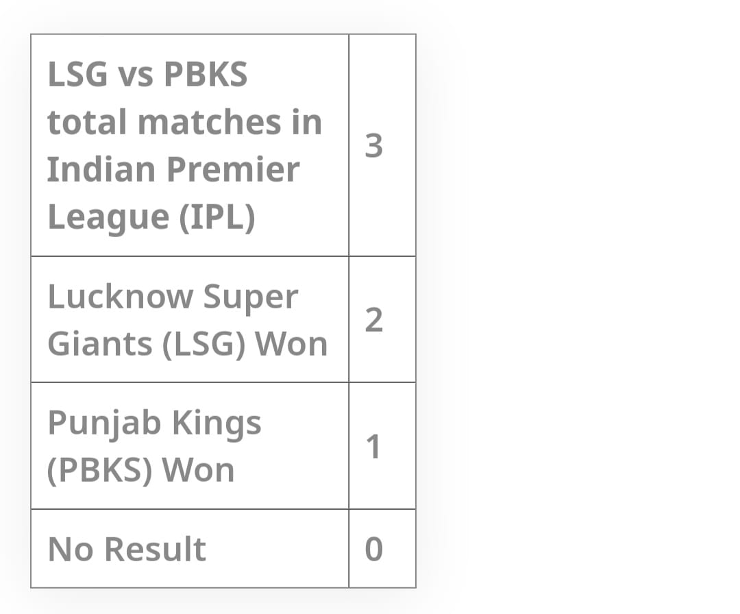Lucknow Super Giants (LSG) vs punjab Kings (PBKS) head-to-head record in indian Premier League (IPL)