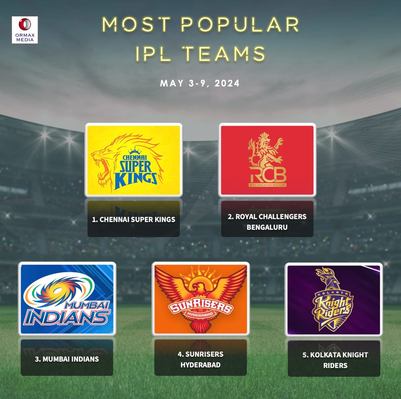 కోల్కతా నైట్ రైడర్స్ : తాజాగా ఆర్మాక్స్ సంస్థ నిర్వహించిన సర్వే ప్రకారం మే నెలలో ఈ జట్టు మొదటి స్థానంలో నిలిచింది.