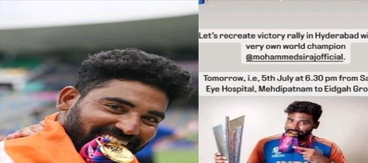 టి20 ప్రపంచ కప్ విజేత మహమ్మద్ సిరాజ్ నేడు హైదరాబాద్లో రోడ్ షో నిర్వహించనున్నారు. ఇందుకు సంబంధించిన ఏర్పాట్లను ఆయన అభిమానులు పర్యవేక్షిస్తున్నారు అన్నది తెలుస్తుంది. సాయంత్రం 6:30 గంటలకు మెహదీపట్నంలోని సరోజినీ ఐ హాస్పిటల్ నుంచి ఈద్గా మైదానం వరకు ఈ రోడ్ షో కొనసాగుతుందట. అయితే రోడ్ షోకు అభిమానులు తరలిరావాలని సిరాజ్ తన సోషల్ మీడియాలో కోరారు. కాగా నిన్న టీమిండియా ఆటగాళ్లు అందరూ కూడా ముంబైలో రోడ్ షో నిర్వహించగా అభిమానులు లక్షల్లో తరలివచ్చారు అన్న విషయం తెలిసిందే.