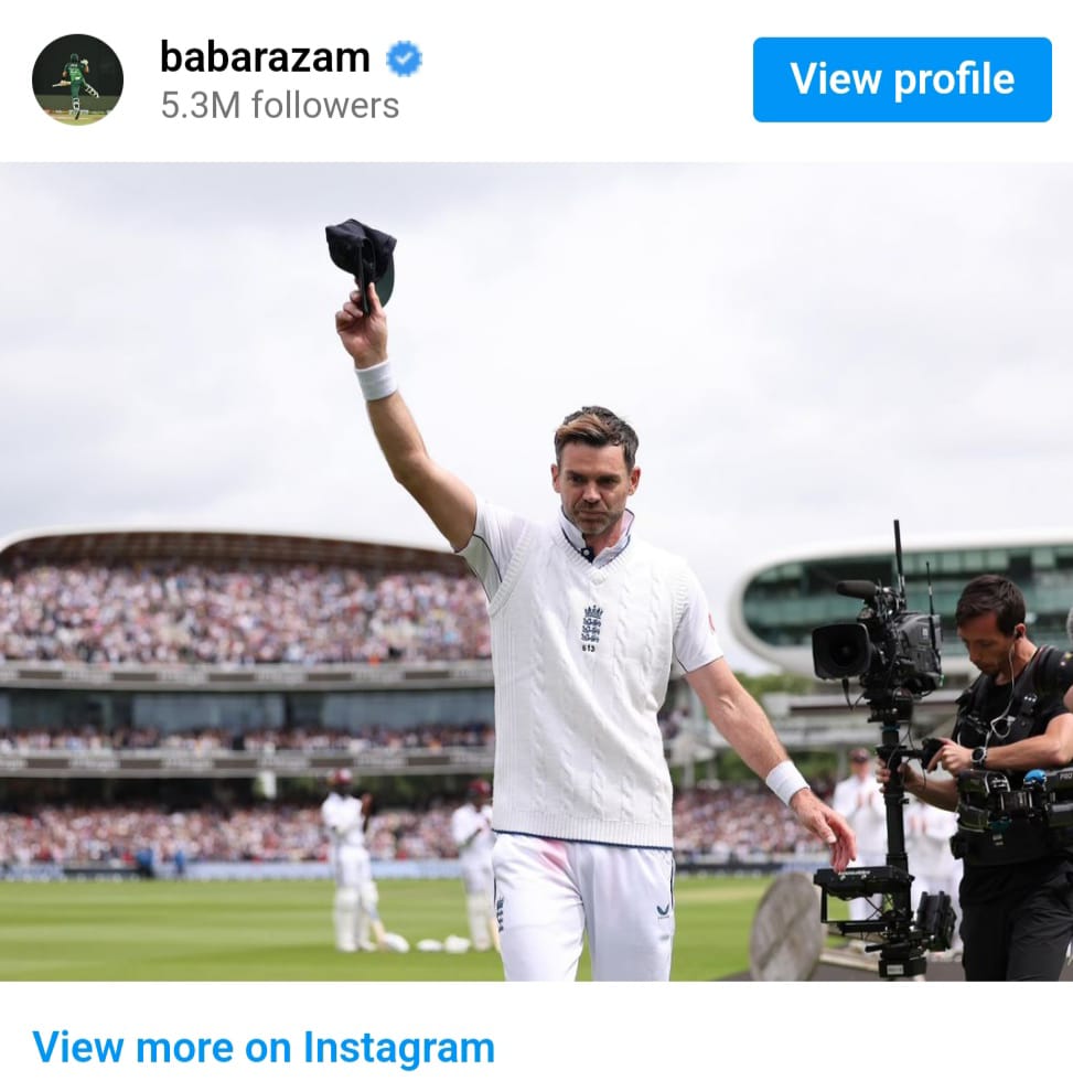 "It was a privilege to face your cutters, Jimmy! The beautiful game will now miss one of its greatest. Your incredible service to the sport has been nothing short of remarkable. Huge respect for you, GOAT," Babar initially wrote in his tribute post for England's james Anderson, who played his final Test on Friday.