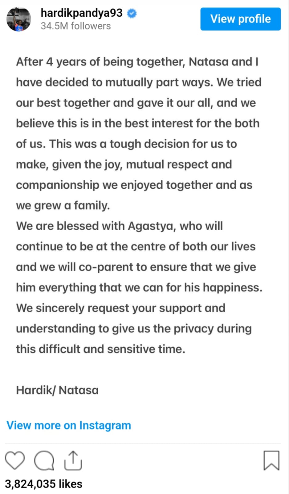 The joint statement read, “After 4 years of being together, hardik and I have decided to mutually part ways. We tried our best together and gave it our all, and we believe this is in the best interest of both of us. This was a tough decision for us to make, given the joy, mutual respect, and companionship we enjoyed together as we grew a family.”