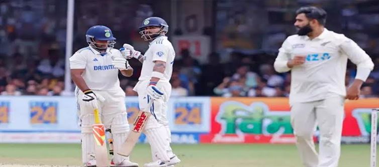 న్యూజిలాండ్‌తో జరిగిన ఒక టెస్ట్ మ్యాచ్‌లో భారత జట్టు 356 పరుగుల వెనుకబడి ఉంది. అంటే, భారత జట్టు న్యూజిలాండ్ జట్టు కంటే 356 పరుగులు తక్కువ చేసింది. అయినా కూడా, భారత జట్టు ధైర్యంగా ఆడి మూడో రోజు ఆట ముగిసే సమయానికి 231 పరుగులు చేసింది.న్యూజిలాండ్ జట్టు మొదట బ్యాటింగ్ చేసి 402 పరుగులు చేసింది. ఈ పరుగుల్లో ఎనిమిదో వికెట్‌కు రచీన్ రవింద్ర (134 పరుగులు), టిమ్ సౌతి (63 పరుగులు) కలిసి 134 పరుగుల భాగస్వామ్యాన్ని నెలకొల్పడం విశేషం. న్యూజిలాండ్ జట్టు ఈ ఇద్దరి ఆటగాళ్ల కారణంగా పెద్ద స్కోర్ చేయగలిగింది.ఇక భారత జట్టు తన వంతుగా బ్యాటింగ్ చేసింది. ఈ మ్యాచ్‌లో విరాట్ కోహ్లీ 9000 టెస్ట్ పరుగులు పూర్తి చేసుకున్నాడు. అంతేకాకుండా, 70 పరుగులు చేసి ఆడటం ఆపివేయబడ్డాడు. రోహిత్ శర్మ 52 పరుగులు, సర్ఫరాజ్ ఖాన్ 70 పరుగులు చేసి జట్టుకు మద్దతు నిలిచారు. కానీ చివరికి టీమ్ ఇండియా ఎనిమిది వికెట్ల తేడాతో ఓడిపోయింది.