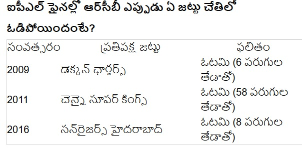 గతంలో మూడు సార్లు ఫైనల్ వరకు వచ్చి ఫైనల్స్ లో ఓడిపోయింది ఆర్ బి సి . టోర్నమెంట్ అంతా బాగా రానిస్తుంది. కానీ టైటిల్ మ్యాచ్లో మాత్రం ఆ ఉత్సాహం కోల్పోతుంది . ఈసారి కూడా ఇలాంటిదే జరిగితే ఖచ్చితంగా ఆర్ బి సి ఫ్యాన్స్ కు నిరాశ తప్పదు . ఫైనల్ మ్యాచ్ గణాంకాలు మాత్రం బెంగళూరుకు అనుకూలంగా లేవు . ఒకవేళ కెప్టెన్ తన మ్యాజిక్ తో ఈసారి ఏదైనా భారీ మార్పులు చేసి ఫైనల్ మ్యాచ్ లో అదే ఉత్సాహం చూపిస్తే మాత్రం ఖచ్చితంగా ఈసారి కప్పు మాత్రం ఆర్ సి బీ దే అంటున్నారు అభిమానులు . చూద్దాం మరి ఏం జరుగుతుందో..? మరికొద్ది గంటల్లోనే ఈ ఊహ గాణాలకు తెరపడిపోబోతుంది..!