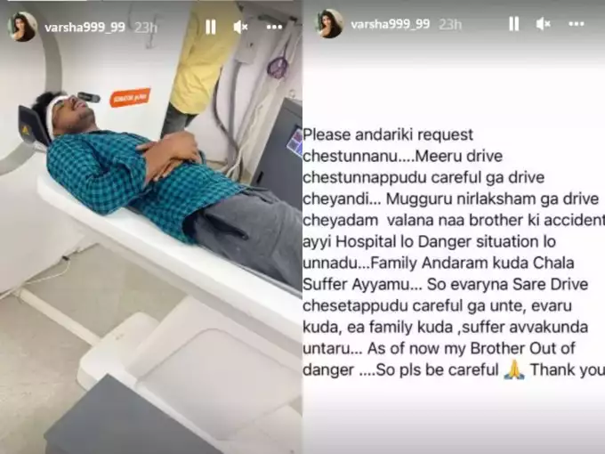 వర్ష తన కెరియర్ పరంగా చాలా బిజీగా ఉన్నప్పటికీ సోషల్ మీడియాకి మాత్రం కాస్త తన సమయాన్ని కేటాయిస్తుందని చెప్పవచ్చు. ఇప్పుడు తన అందమైన ఫోటోలు షేర్ చేస్తూ ఉండే వర్ష ఈసారి మాత్రం ఒక చేదు ఘటనను షేర్ చేసింది.. అదేమిటంటే తన సోదరుడు రోడ్డు ప్రమాదానికి గురైనట్లుగా తెలియజేసింది వర్ష. హాస్పిటల్లో రక్తపుమడుగులో తన సోదరుడు ఉన్నటువంటి కొన్ని ఫోటోలను ఇన్స్టాగ్రామ్ ద్వారా షేర్ చేసింది. అలా షేర్ చేస్తూనే.. ప్రతి ఒక్కరు డ్రైవింగ్ చేసేటప్పుడు ఎంతో జాగ్రత్తగా ఉండాలని అందరినీ వేడుకుంటోంది.