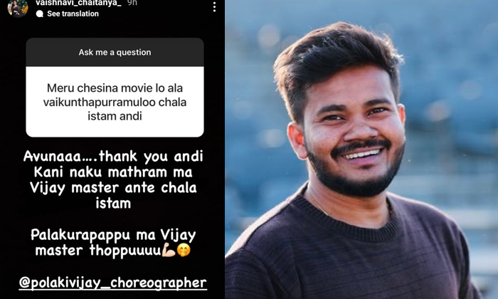 యూట్యూబ్లో కూడా మంచి సక్సెస్ కావడంతో ఇక మోడల్ గా మంచి క్రేజ్ అందుకున్నది. అంతేకాకుండా వెండితెరపై కూడా పలు అవకాశాలను అందుకున్నది. అలా వైకుంఠపురం సినిమాలో అల్లు అర్జున్ సోదరిగా నటించి మంచి మార్కులు సంపాదించుకుంది. ఇక ఈమె ఎక్కువగా సాఫ్ట్వేర్ డెవలపర్ అని వెబ్ సిరీస్ తో కూడా మంచి గుర్తింపు తెచ్చుకున్నది. అందులో షణ్ముఖ్ జస్వంత్ కూడా నటించారు. ఇక ఈమెకు యూట్యూబ్ లో కూడా 400k సబ్స్క్రైబ్ ఉన్నారు. ఇంస్టాగ్రామ్ లో 700k ఫాలోవర్స్ కలిగి ఉన్నది. వైష్ణవి ఎక్కువగా ఇంట్లో కంటే నెట్టింట్లో బాగా యాక్టివ్గానే కనిపిస్తూ ఉంటుంది. అలా అలా వైష్ణవి ఒక నెటిజన్ అడిగిన ప్రశ్నకు సమాధానాన్ని తెలియజేసింది. అలా వైకుంఠపురం సినిమాలో మీరంటే చాలా ఇష్టం అని అనడంతో వెంటనే వైష్ణవి థ్యాంక్యూ అంటూ తనకు కొరియోగ్రాఫర్ విజయ్ అంటే ఇష్టం అని తెలియజేసింది.