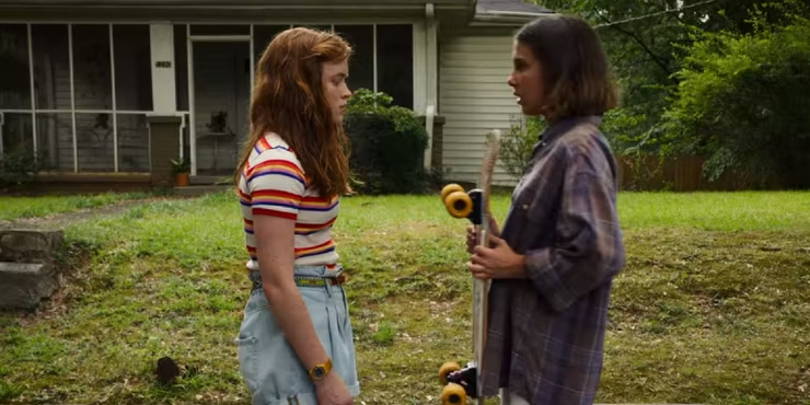In the Stranger Things episode "The Piggyback," Eleven spots a young Max skating in Los Angeles. In the recollection, young Max is challenged by a teenager who is making fun of her for skating, and she responds, "Shouldn't you bag your face?," while flashing her trademark middle finger. The recollection itself doesn't add much to Max's character development because it merely confirms what is already known about her. Max has tomboyish hobbies, she has always experienced hardship, and she utilises dismissiveness and sass as emotional coping techniques.