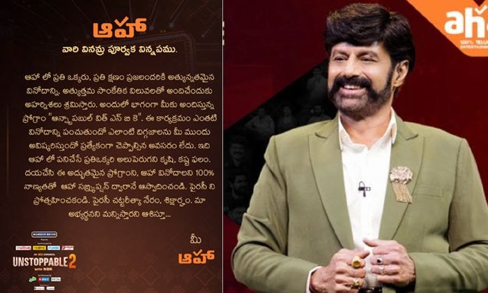 ఆన్ స్టాపబుల్ మొదటి సీజన్ ఎంతమంది జీవితాలను మార్చింది. బాలకృష్ణ తో పాటు ప్రోగ్రాంలో పార్టిసిపేషన్ చేసిన గెస్టులు ఎంతో మంది సహాయాన్ని అందించి ఎంతోమంది జీవితాలను మార్చారు.ఇలాంటి ప్రోగ్రాం మరింత మందికి చేరువ చేయడం కోసం ఆహా మరొకసారి తన ముందడుగు వేస్తోంది. నందమూరి హార్డ్ కోర్ ఫాన్స్ అందరు సే నో టు పైరసీ అని ముందుకు రావాలని కోరింది. అన్ స్టాపబుల్ సీజన్ 1 లో అక్రమంగా పలు వెబ్సైట్లో తమకు సంబంధించిన కొన్ని వీడియోస్ అందుబాటులో ఉన్నాయని ఇలాంటి అక్రమాలకు చెక్ పెడుతూ పోరాటం చేయడానికి ఆహ ముందడుగులు వేస్తోంది అని ఆహా సంస్థ తెలియజేసింది..అన్ స్టాపబుల్ విత్ ఎన్.బి.కె -2 ను ఎవరైనా పైరసీ చేసినట్లు అయితే వెంటనే ఆ పైరసీకి సంబంధించిన ఫోటోలను వీడియోలను జత చేస్తు..9393950505 / ఎపిసి50505@gmail.com ల వివరాలను తెలియజేయాలని ఆహా సంస్థ ప్రేక్షకులను కోరుకుంటుంది. అలాంటి వ్యక్తులు లేదా సంస్థలపై ఆహా వారు చట్టపరమైన సివిల్ క్రిమినల్ కేసులకు ద్వారా చర్యలు తీసుకుంటారని తెలియజేశారు. ఈ విషయాన్ని ఆహ సీఈవో అజిత్ ఠాగూర్ తెలియజేశారు. ప్రస్తుతం ఈ విషయం మాత్రం హాట్ టాపిక్ గా మారుతోందని చెప్పవచ్చు.