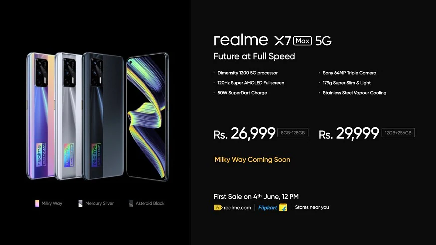 6). రియల్ మీ ఎక్స్ 7 మాక్స్ 5 జి స్మార్ట్ ఫోన్ ధరలు 8 జీబీ +128 జీబీ వేరియంట్ ధర రూ.26,999, మరియు 12జీబీ + 256 జీబి వెరియంట్ ధర రూ.29,999 రూపాయలు లభిస్తుంది.