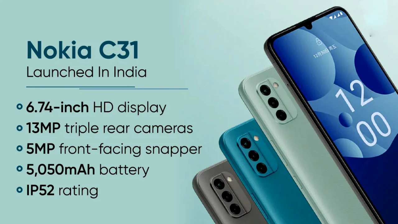 Nokia c-31 మొబైల్ నేటి నుంచి అందుబాటులో ఉండనుంది.3gb ram+32 gb స్టోరేజ్ తో ఈ మొబైల్ కలదు.ఈ మొబైల్ ధర విషయానికి వస్తే రూ.9,999 రూపాయలకే అందుబాటులో ఉండనంది.4gb+64 GB స్టోరేజ్ మెమొరీ ఆప్షన్ గల మొబైల్ 10,999 అందుబాటులో కలదు. ఈ మొబైల్ ప్రస్తుతం మూడు కలర్లలో లభిస్తుంది. మొబైల్ టైప్ సి చార్జింగ్ సపోర్ట్ తో పనిచేస్తుంది. వాటర్ ప్రూఫ్ మొబైల్ గా కూడా ఉండడమే కాకుండా స్టైల్ నాచును కూడా కలిగి ఉంది స్క్రీన్ చాలా థిక్ నెస్ తో తయారు చేయబడినట్లుగా తెలుస్తోంది.10 w ఫాస్ట్ ఛార్జింగ్ పాటు 5000 mah బ్యాటరీ సామర్థ్యం కలదు. ఈ మొబైల్లో సరికొత్త అంగులతో టెక్నాలజీతో ఈ మొబైల్ ఉన్నదని తెలియజేస్తున్నారు.