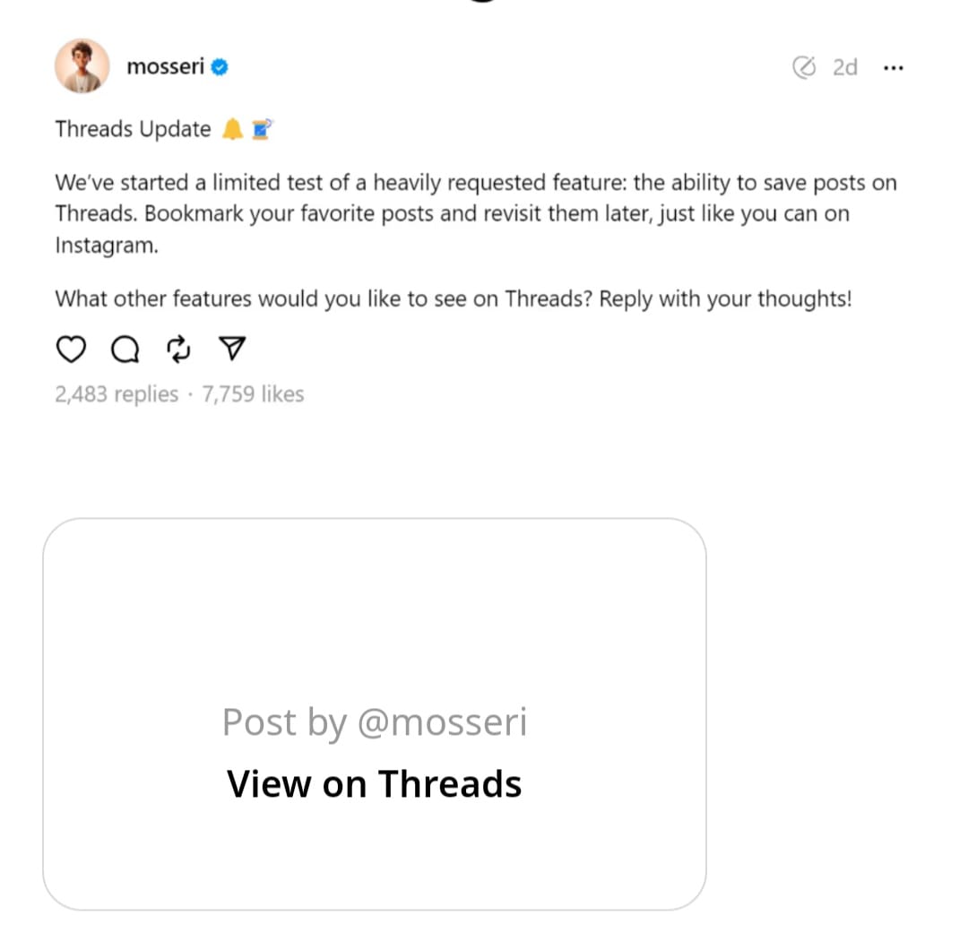 In a distinct development, Threads is undergoing testing for a new feature. Soon, users will have the ability to save their preferred posts by selecting the "Save" option. Adam Mosseri, the head of instagram who also oversees Threads, mentioned in a post that this feature will function similarly to the Bookmark feature on Instagram. While there is no specified date for the release of this feature, it is anticipated to be available to both beta testers and regular users shortly.