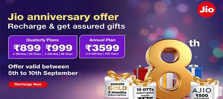 దీంతో యూజర్స్ ప్రభుత్వ రంగ సంస్థలైన బిఎస్ఎన్ఎల్ వైపుగా మగ్గుచూపుతున్నట్లు తెలుస్తోంది. ముఖ్యంగా ఇందులో రీఛార్జ్ ప్లాన్స్ తక్కువగా ఉండడమే కాకుండా త్వరలోనే 4g ,5g సేవలను కూడా అందించే విధంగా బిఎస్ఎన్ఎల్ చర్యలు తీసుకోబోతున్నారట. ఇలాంటి సమయంలోనే తాజాగా జియో యూజర్స్ కు ఒక గుడ్ న్యూస్ తెలియజేసింది. రీఛార్జి ప్లాన్స్ ధరలలో భారీ ఆఫర్లను కూడా ప్రకటించింది జియో.. జియో 8వ వార్షికోత్సవం సందర్భంగా పలు రకాల ఆఫర్లను అందించారు.