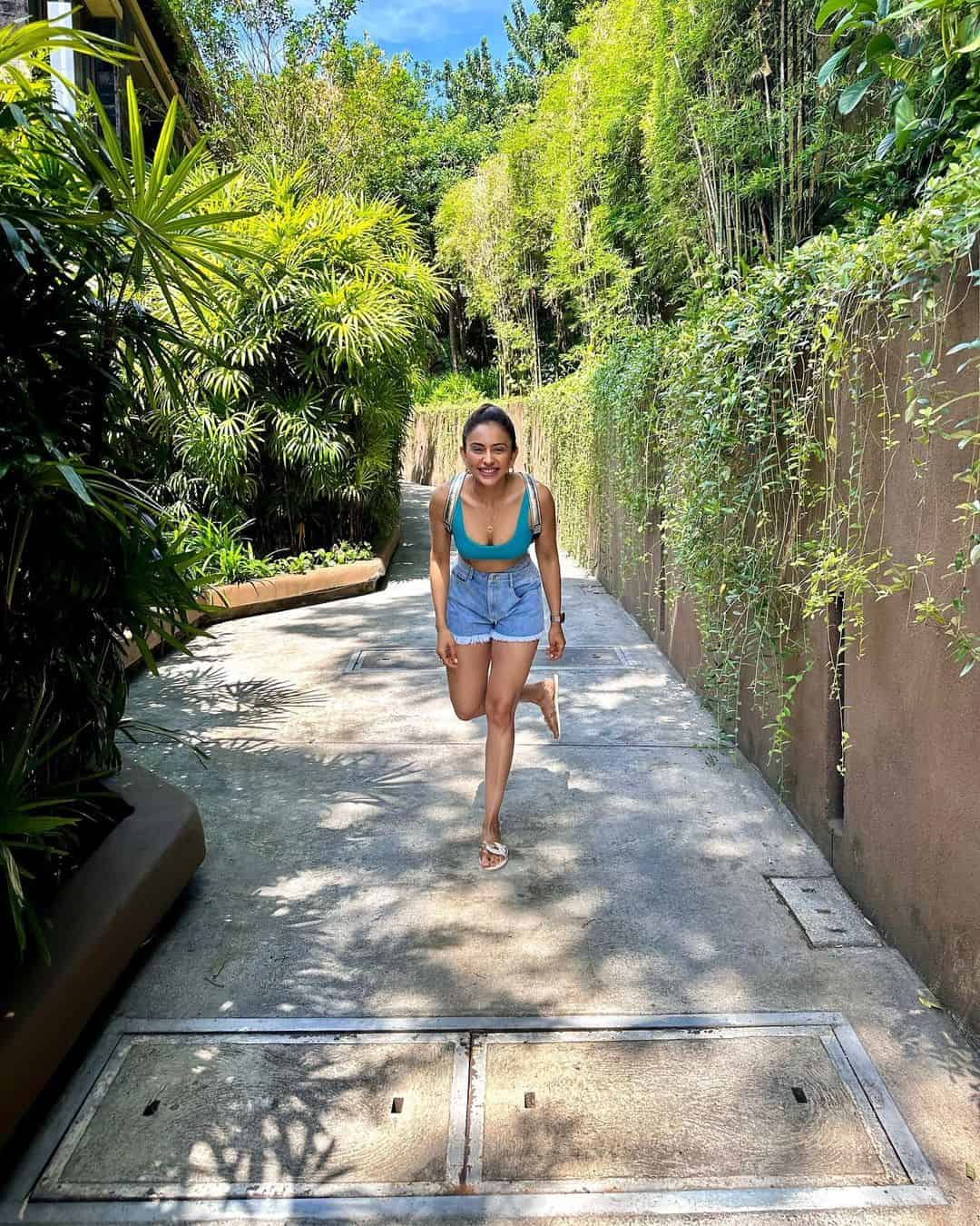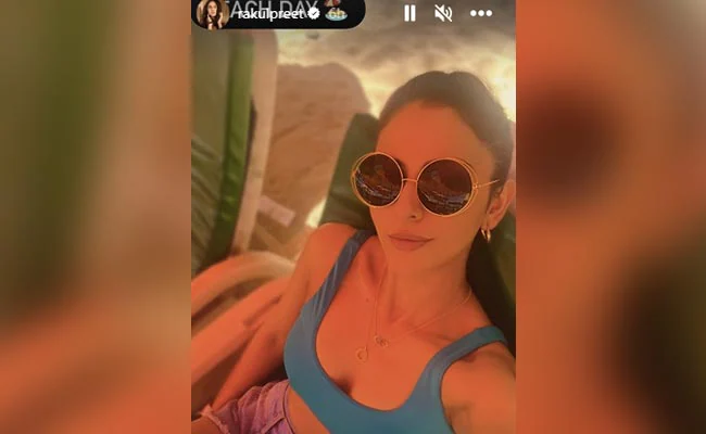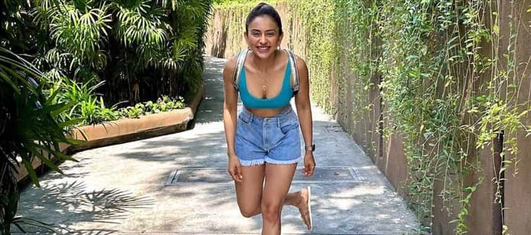 rakul shared some photos of her holiday start on Instagram, and in them, she can be seen wearing a bright blue sleeveless bralette under a pair of light blue denim shorts with a high waist.