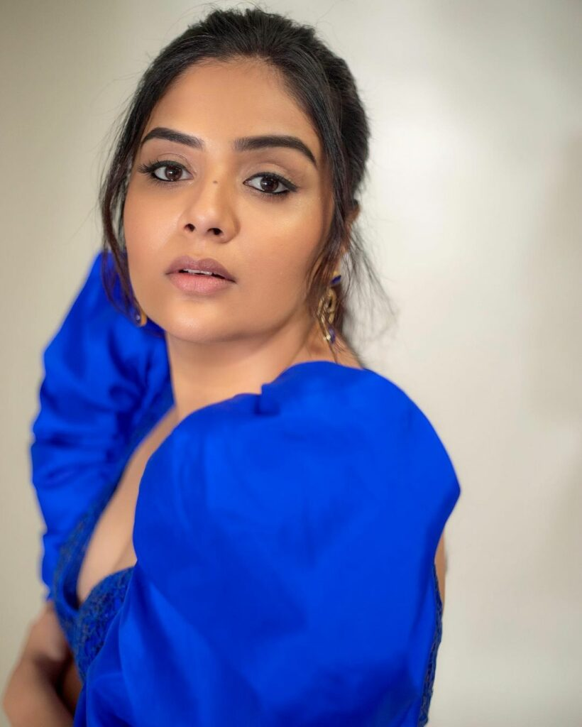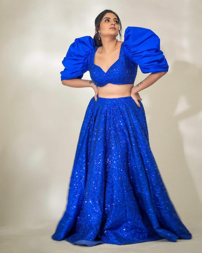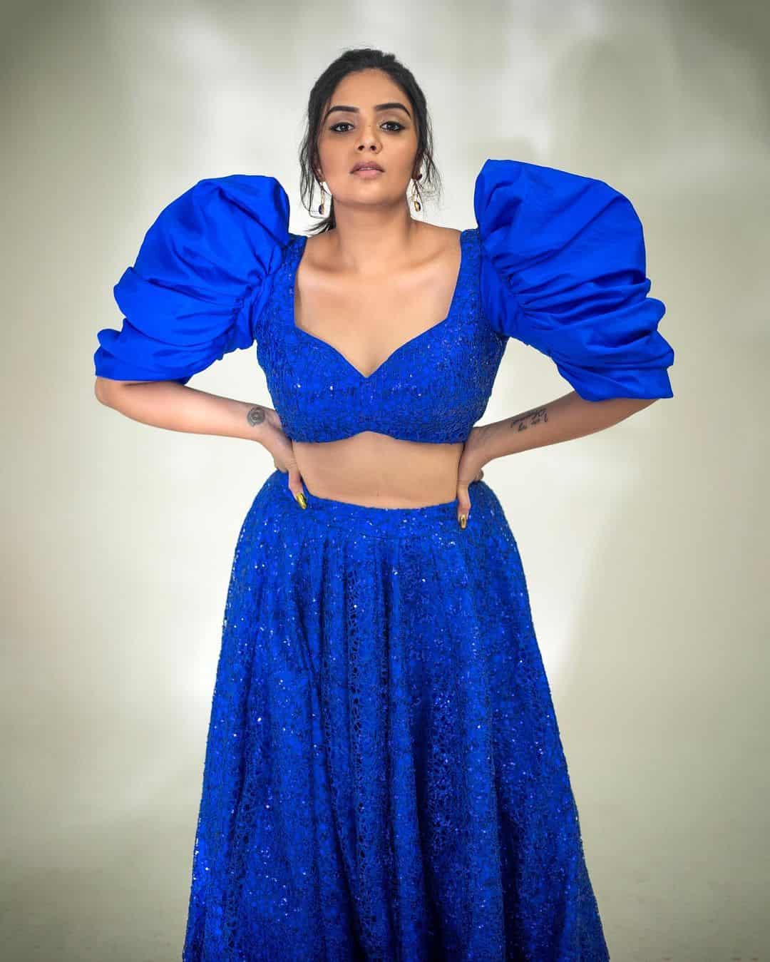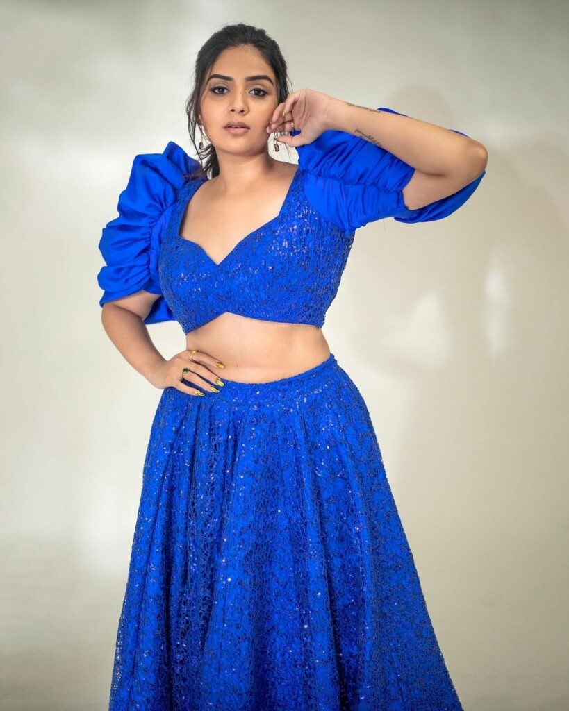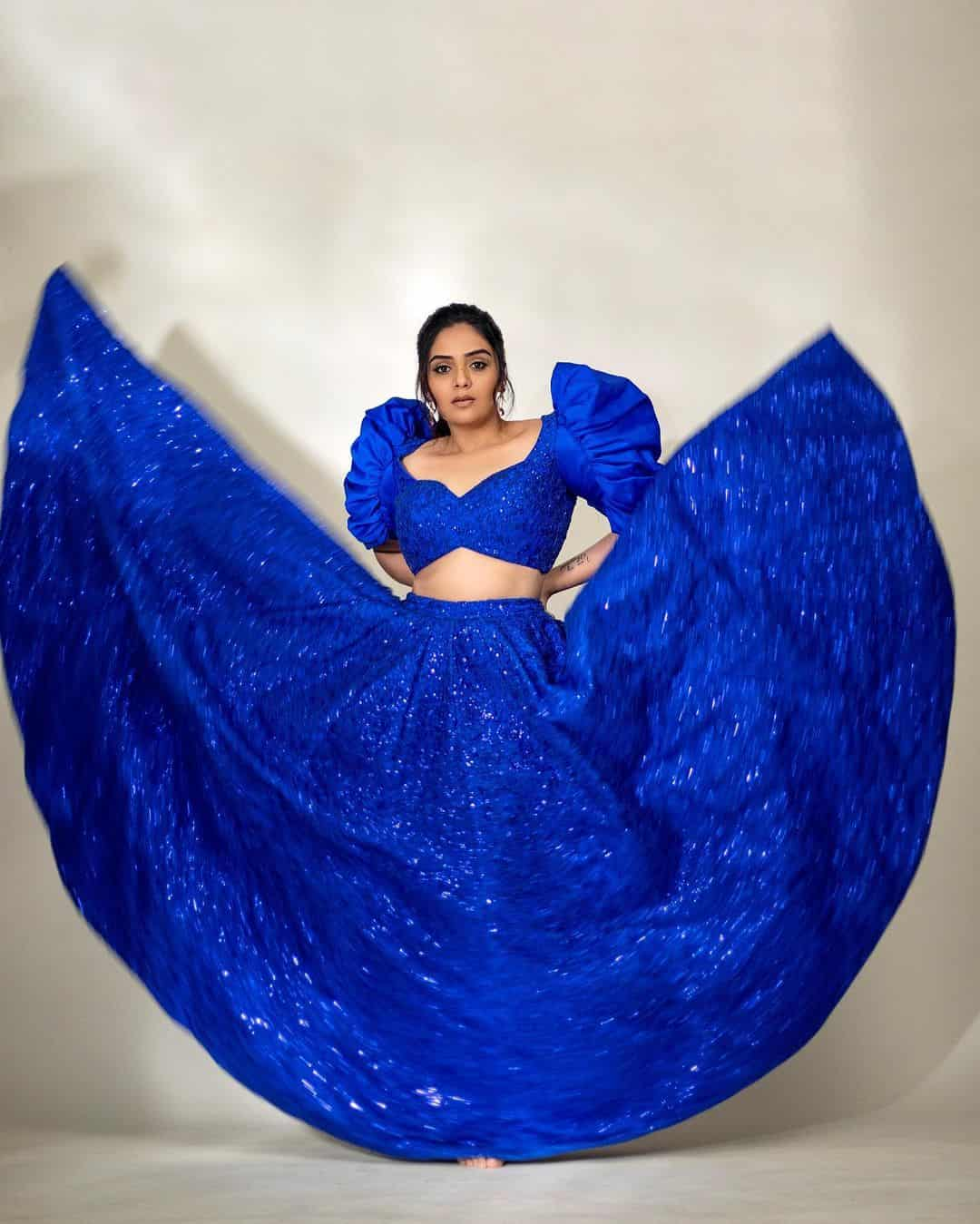 Sreemukhi always impresses audiences with her extraordinary acting skills, whether she's on stage or in front of a camera. Over time, she has emerged as the most in-demand anchor. The diva is photographed today wearing a gorgeous all-blue ensemble. She was dressed in a matching cobalt blue blouse and lehenga, and her make-up was kept to a minimum. She wore golden earrings, nail paint, and a diamond ring on her index finger in place of neck jewellery. Raise the bar for ethnic