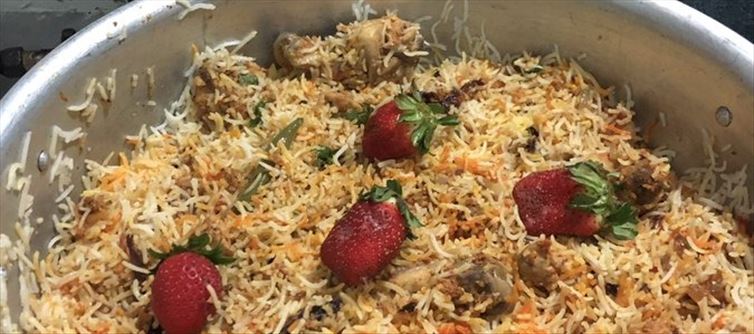 ഹോട്ടലിന്റെ ട്വിറ്റെർ പേജിലാണ് സ്ട്രോബെറി ചേർത്ത ബിരിയാണിയുടെ ഫോട്ടോ പോസ്റ്റ് ചെയ്തിരിക്കുന്നത്. ഒരു വലിയ ചെമ്പിൽ തയ്യാറാക്കിയിരിക്കുന്ന ബിരിയാണിയിലാണ് സ്ട്രോബെറി ഗാർണിഷ് ചെയ്തിരിക്കുന്നത്. യഥാർത്ഥത്തിൽ ബിരിയാണിയിൽ സ്ട്രോബെറി ഇട്ടു തയ്യാറാക്കിയതാണോ അതോ ബിരിയാണി ഉണ്ടാക്കിയതിന് ശേഷം സ്ട്രോബെറി ഭംഗിക്കായി ചേർത്തതാണോ എന്ന് വ്യക്തമല്ല.