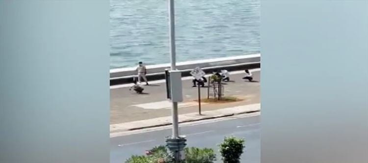 एक कथित वीडियो में, एक पुलिसकर्मी को एक छड़ी के साथ देखा जा सकता है, चार लोगों को देख रहा है जैसे वे स्क्वाट करते हैं और पृष्ठभूमि में मरीन ड्राइव के साथ चलते हैं।