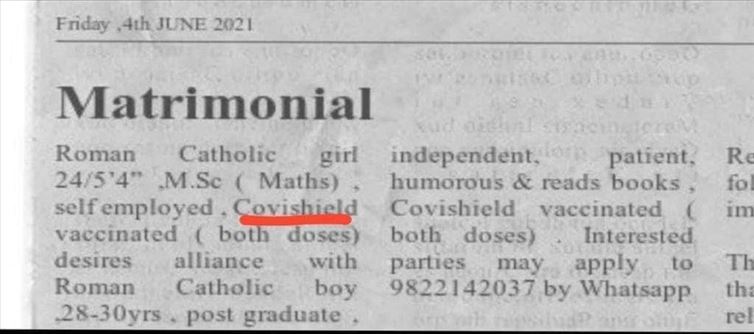 A Matrimonial ad says that a vaccinated bride expects a groom who is also vaccinated. Seems we have gone past the days where we are no longer going to see a groom who earns in 6 digits, has own house, car, and so on. Maybe getting vaccinated is the new norm for the matrimonial advertisement too. The viral advertisement was tweeted and shared by shashi kapoor himself and it has gone viral on social networks.