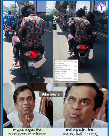హైదరాబాద్ పోలీసులు కూడా ఫన్నీగా మీమ్స్ చేస్తూ ట్రాఫిక్ రూల్స్ ఉల్లంగించిన వారి భరతం పడుతున్నారు. ఇక ఈ ఫన్నీ మీమ్స్తో ఓ వైపు ట్రాఫింక్ ఉల్లంఘనలను భారీ తమ జరిమానాలతో హడలెత్తిస్తూనే మరోవైపు ట్రాఫిక్ నిబంధనలు ఉల్లంఘించాలంటే భయపడేలా వాహనదారులను బాగానే కంట్రోల్ చేస్తున్నారు. ఎవరైనా సరే ట్రాఫిక్ నిబంధనలు ఉల్లంఘిస్తూ కెమెరాకు చిక్కడమే ఆలస్యం.. ఆ ఫోటోను పోలీసులు ఓ రేంజ్లో తెగ వాడేసుకుంటున్నారు.