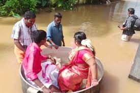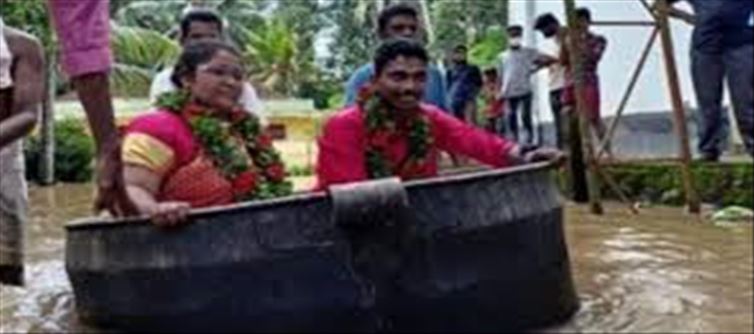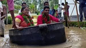 As a result, while the public's daily life has been disrupted across the state, there has been a joyful marriage. A horse-drawn carriage, automobile, or another mode of transportation is traditionally offered to a newlywed couple. However, because of severe rain, a couple from alappuzha was taken to the wedding house in a large metal cooking pot along flooded roads.
