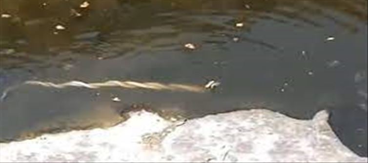 Two snakes, around eight feet long, can be seen leisurely circling in the water, surrounded by flora, in the video.