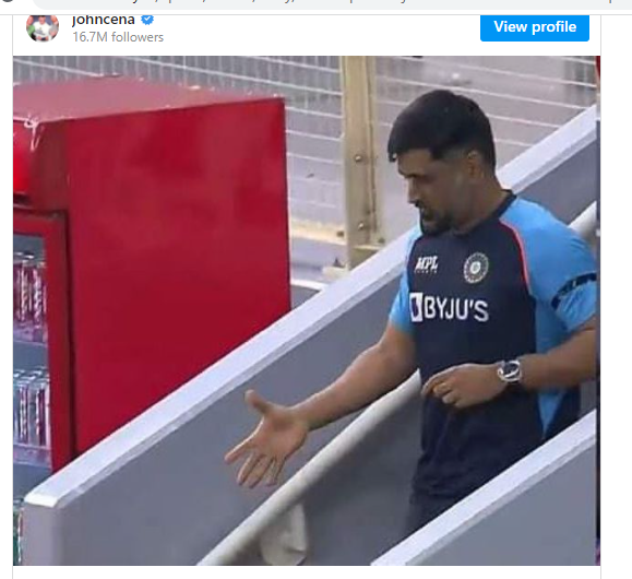 John Cena's post may be funny or sometimes even confusing to all fans. His post of dhoni walking down the stairs and trying to greet someone, made his fans confused about who he is greeting. They settled with their answer of john Cena himself may be greeting dhoni in the picture. The post doesn't have any caption also. john Cena's 'You cant see me' jokes are known by all and are iconic too. Many jokes have been trolling on the internet and even john Cena used to joke himself using the memes many times. In the comments section, many fans comment seeing Dhoni's photo as 'two legends shaking', 'MSD meeting JC'etc.