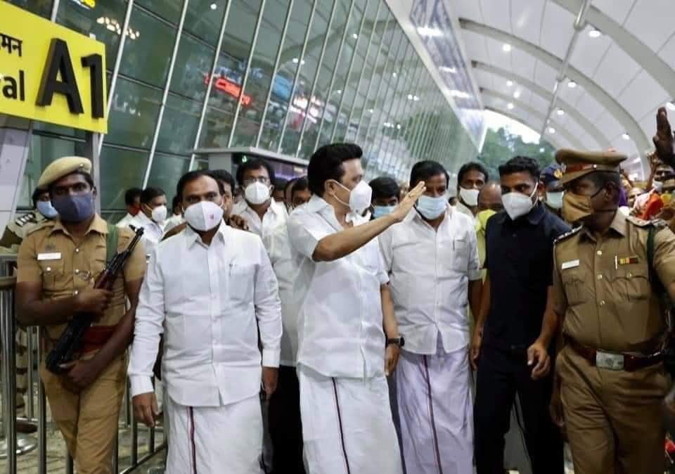 MK stalin, who had earlier arrived in coimbatore from Chennai, was given an enthusiastic welcome at the airport.