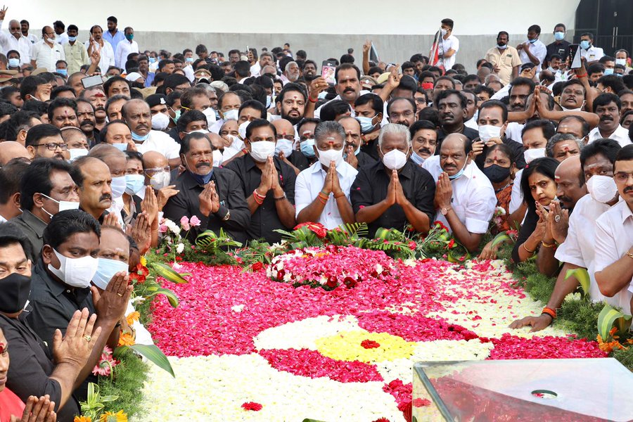 AIADMK coordinator O. Panneerselvam and co-coordinator Edappadi Palanisamy paid floral tributes to former chief minister Jayalalithaa at her memorial in chennai on the occasion of her 5th anniversary.