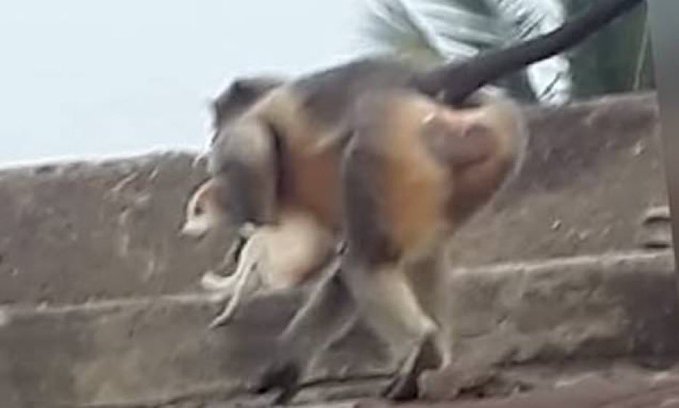 As a result, they are now harassing children who go to school. Images confirming the attack are now appearing in the media. In one, a monkey is seen dragging a puppy to the top of a building and dropping it from the roof. In another video, women and children in the area are seen running for safety while dogs chase monkeys.