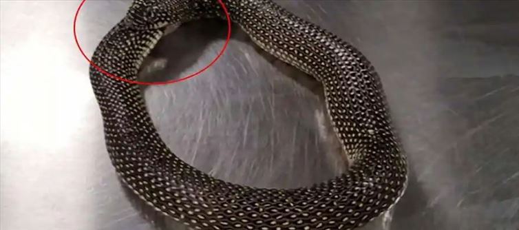 నల్లని చర్మం పై తెల్లని మచ్చలు ఉన్న ఒక పాము తనని తానే తినెందుకు ప్రయత్నించింది. వెనుక భాగాన్ని తనకు అదే తింటున్న దృశ్యాన్ని రికార్డు చేసి సోషల్‌ మీడియా లో అప్‌లోడ్‌ చేశారు. యజమాని రాబ్ క్లార్క్ వెనిటాక్స్ పామును ఆపడానికి చేసిన ప్రయత్నం ఫలించింది. ఈ వీడియో లో పాము తన తోక భాగాన్ని తినడాన్ని చూడవచ్చు. దాని శరీరంలో ఎక్కువ భాగం మింగేసింది. అయితే ఆ పాము యజమాని పాము తల పై హ్యాండ్ శానిటైజర్‌ ను పూసేందుకు ప్రయత్నించాడు. సాదారణంగా చెప్పాలంటే ఆ శానిటైజర్‌ను ఇష్టపడవు.