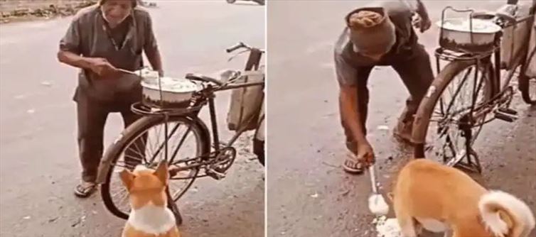 పూర్తి వివరాల్లోకి వెళితే ఒక పెద్దాయనకు ఆకలితో తిరుగుతోన్న ఓ వీధి కుక్క కనిపించింది. దీంతో అతను సైకిల్ తీసుకొచ్చిన అన్నాన్ని ఆ కుక్కకు పెట్టాడు. ఎంతో ఆకలితో ఉన్న ఆ కుక్క కడుపునిండా లాగించేసింది. ఆ సమయంలో ఆ పెద్దాయన కళ్లల్లో కనిపించిన సంతోషం ఎన్ని డబ్బులు పెట్టిన కాని దొరకదు అని చెప్పడంలో ఎలాంటి సందేహం అనేది లేదు.పేదవాడే కానీ దానంలో ధనవంతుడు.