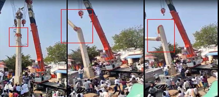 అయితే 80 టన్నుల బరువు ఎత్తే రెండు పెద్ద క్రేన్లను అక్కడికి తీసుకు రావడం జరిగింది నిర్వాహకులు. అయితే ఈ పనిని ఇంజనీర్ల సహాయంతోనే ఈ ధ్వజ స్తంభాన్ని పక్కకు జరిపి ప్రయత్నాన్ని చేశారు. భూమిలో నుంచి పైకి తీయడంలో మాత్రం బాగా సక్సెస్ అయ్యారు ఆపరేటర్లు.. మరింత కాస్త పైకి లేపి ఎత్తుతూ ఉండగా ఒక్కసారిగా ధ్వజస్తంభం పైన భాగం విరిగి కింద పడిపోయింది.. దాంతో అక్కడున్న ప్రజలు అంతా భయభ్రాంతులయ్యారు.. కానీ ఎవరికీ ఎటువంటి గాయాలు కాకపోవడంతో కాస్త ఊపిరి పీల్చుకున్నారు ఊరి ప్రజలు. ప్రస్తుతం ఈ వీడియో నెట్టింట్లో తెగ వైరల్ గా మారుతోంది.