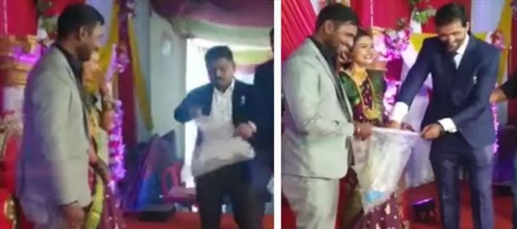 ఇందుకు సంబంధించిన వీడియో ఒకటి నెట్టింట చక్కర్లు కొడుతోంది.. వివరాల్లొకి వెళితే.. వీడియో లో వధూవరులిద్దరు స్టేజ్ పై ఉండగా.. ముందుగా ఓ వ్యక్తి వచ్చి వారిద్దరి ఓ ఖాళీ కవర్ ఇచ్చి పట్టుకోమని చెప్తాడు. అందరు కవర్ లో ఎముందొ అని ఆసక్థిగా ఎదురు చూస్తున్నారు.వధూవరులను ఆటపట్టించడానికి కామెడీగా బహుమతులు ఇస్తుంటారు. ఫ్రెండ్స్ అందరూ వచ్చి ఒక్కొక్కరుగా గిఫ్ట్ లను అందలొ వేశారు. సోప్ బాక్స్.. పిండి జల్లెడ, బకెట్, మగ్గు వంటి వస్తువులను తీసుకువస్తూ ఆ కవర్లో వేశారు. కాగా, తమ స్నేహితులు ఇస్తున్న ఆ వస్తువుల ను ఆ నూతన జంట నవ్వుతూనే అందుకున్నారు.. మొత్తానికి ఈ పెళ్ళి మాత్రం నెవ్వర్ బిఫోర్,ఎవ్వర్ ఆఫ్టర్ అనే చెప్పాలి..