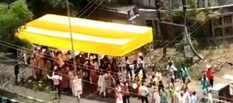 ఎండలు తీవ్రంగా ఉండడంతో ఇక ఎండ వేడి నుంచి తప్పించుకోవడానికి సరికొత్తగా ఆలోచించారు. ఎండ తీవ్రత ఎక్కువగా ఉండటంతో పెళ్లి వారూ ఊరేగింపు కొత్త పద్ధతిలో చేశారు. రోడ్డుపై నుంచి లాక్కుని పోయి ఒకటి టెంట్ చేసారూ. చతురస్ర ఆకారంలో ఉన్న టెంట్ కు చక్రాలు అమర్చారు. నాలుగువైపులా నలుగురు ఉండి ముందుకు నెడుతూ ఉన్నారు. టెంట్ కింద పెళ్లి కొడుకును గుర్రంపై కూర్చోబెట్టి మండపానికి తీసుకుని వెళుతూ ఉన్నారు. ఇక ఇది కాస్త ప్రస్తుతం సోషల్ మీడియాలో వైరల్ గా మారిపోయింది. ఈ వీడియో చూసి ఎంతో మంది ఫన్నీ కామెంట్స్ చేస్తూ ఉండటం గమనార్హం.