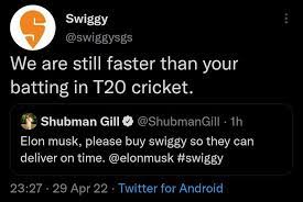 On his twitter page, Shubman posted saying Elon Musk to buy Swiggy. That’s when he posted that they would deliver food on time. Many people have been posting mixed comments under his post. Some have been posting in support of the idea in Shubman and some in condemnation of Shubman Gill. One fake account in the name of swiggy, who has responded to Shubman in particular, replied sarcastically that they are faster than Shubman's batting speed.