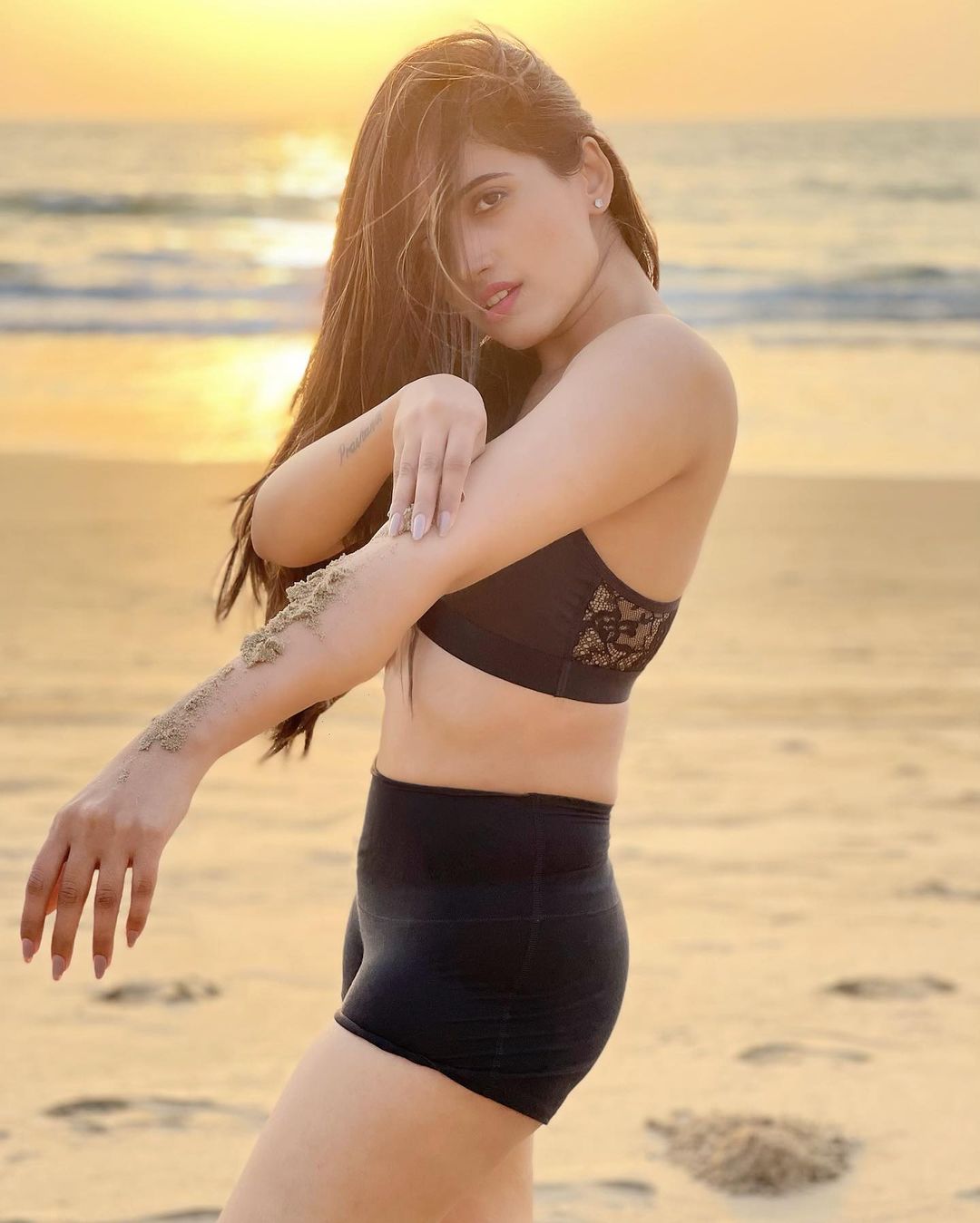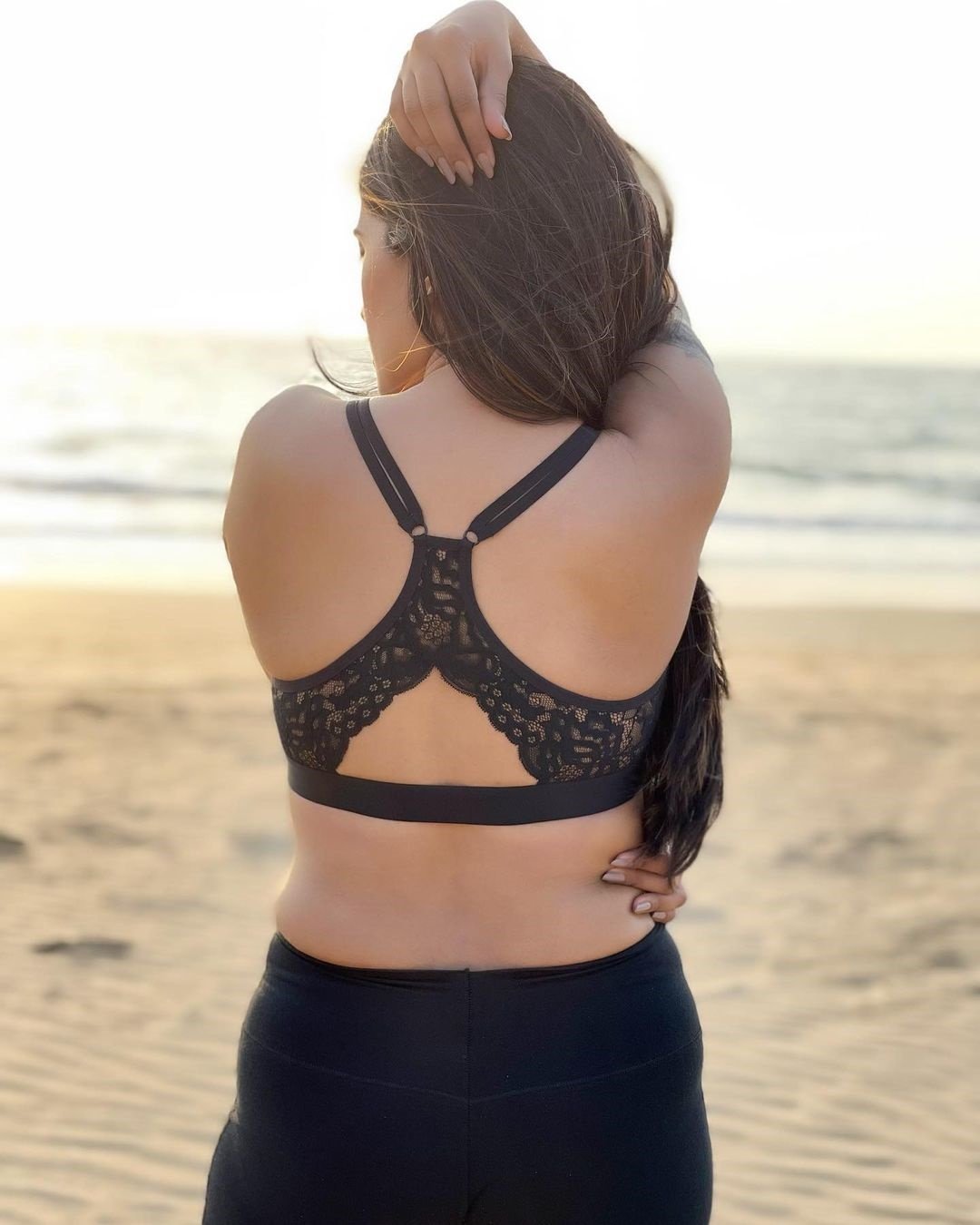 Sravanthi is pictured posing in these pictures at a beach. She is shown in the photos with a black bralette and high-waisted tight shorts. Fans can't sleep at night because of Sravanthi's sensual poses and voluptuous body. She captioned the image, "Sandy salty bright days and complete unadulterated happiness." Many online users believed that Sravanthi possessed all the necessary traits to establish herself as a leading lady in telugu cinema after viewing her images.