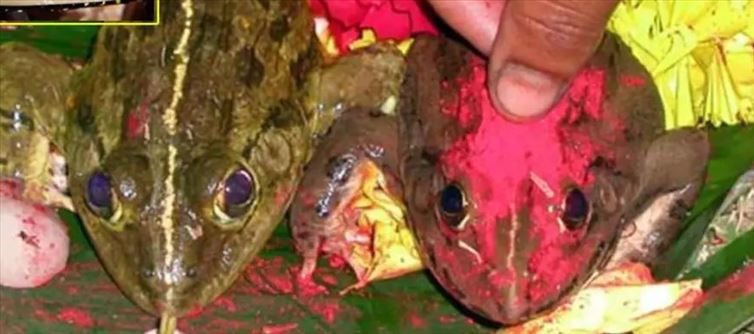 భారత దేశంలోని కొన్ని గ్రామాల్లో రెండు కప్పలను తెచ్చి వాటికి పెళ్ళి చేస్తారు.ఊరంతా వాటిని ఊరేగిస్తారు. ఆ తరువాత వాటిని దగ్గర్లోని చెరువులల్లో విడిచి పెడతారు. ఇలా చేయడం ద్వారా వరుణ దేవుడు కరుణించి.. వర్షాలు కురుస్తాయని ప్రజలు నమ్ముతారు. అయితే కొన్ని ప్రాంతాల్లో.. కప్పలకు విడాకులు కూడా ఇస్తారు. ముఖ్యంగా భోపాల్ లో ఈ కప్పల విడాకుల పద్ధతి భలే వింతగా ఉంటుంది. రెండు కప్పలను పట్టుకుని వాటిలో ఆడకప్పకు ఓ రకం బట్టలు, మగ కప్పకు ఓ రకం బట్టలు వేస్తారు..ఆడ కప్పకు పసుపు కుంకుమ పెడతారు. కాసేపటికి వాటిని పెళ్లి చేసినప్పుడు ఒకే చెరువులో వదిలిస్తారు.విడాకుల తరువాత వేరు వేరు చెరువుల్లో వదులుతారు..