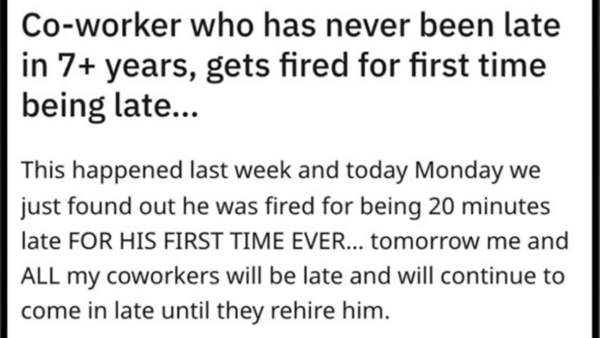 Many office goers may have had this experience. Especially in metro cities like Chennai, Bengaluru, Mumbai, and Delhi, this is also a common thing. You can see employees rushing to work at 7 am itself for the 9 am office. But sometimes, lateness is unavoidable. But can you believe that for the first time in 7 years the late employee has been fired? Can you accept this? But this is a true incident that we cannot even imagine. A person who went early to the office exactly for 7 years, went a day late. We can't even imagine if the company is firing for that. However, the comforting thing about this is that the employee who was fired was also supported by a colleague.This Reddit user who has never been late in 7 years gets fired for being late for the first time. In last week's incident, the employee was fired for the first time for arriving at the office 20 minutes late. Due to this, strict colleagues will also come late to the office the next day. They have said that they will only come until he is rehired. After this, the dismissed employee is reinstated.Meanwhile, many employees are also sharing their views. One user was late once in 6 years which had the biggest impact. He returns from his work at 5 pm. In the morning he was at his place at 9.05. He was not fired for this, but the boss spoke harshly. Also wrote this in his annual review. His goal for next year was to be on time.