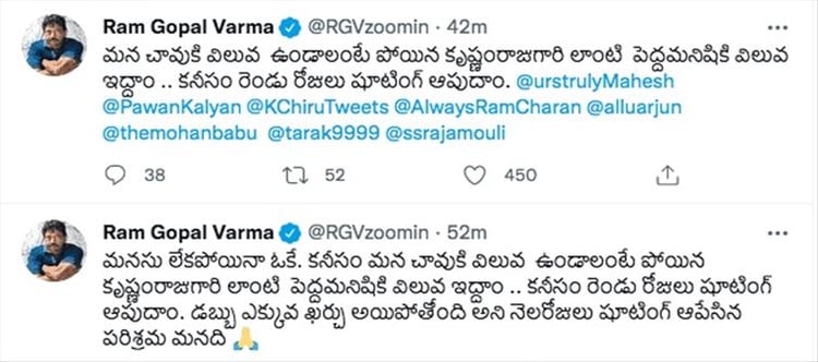 Varma emphasised that tollywood is a place that took almost a month's holiday to control price concerns but won't offer a day holiday on humanitarian grounds. "If your death needs to be cherished, then you need to value the death of a legend like Krishnamraju," he remarked. It appears that varma finally caught some bait after a long time and is chewing it. The director is always known for making such statements and this is nothing new for Tollywood.