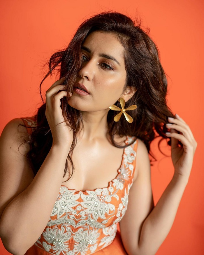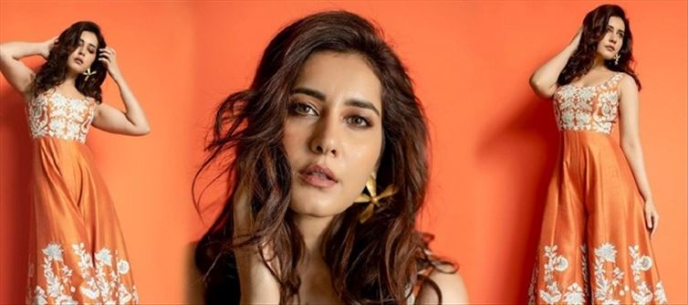 people adore the stunning and skilled actress Raashi Khanna. She puts in a lot of effort to maintain her physical fitness and to update herself over time. Some things can't be adequately described with words. The beloved of many hearts, Raashi Khanna, has seen wearing one of the daring costumes. Raashi appears to have fallen from the skies while donning an orange sleeveless kurti with white embroidery on top.