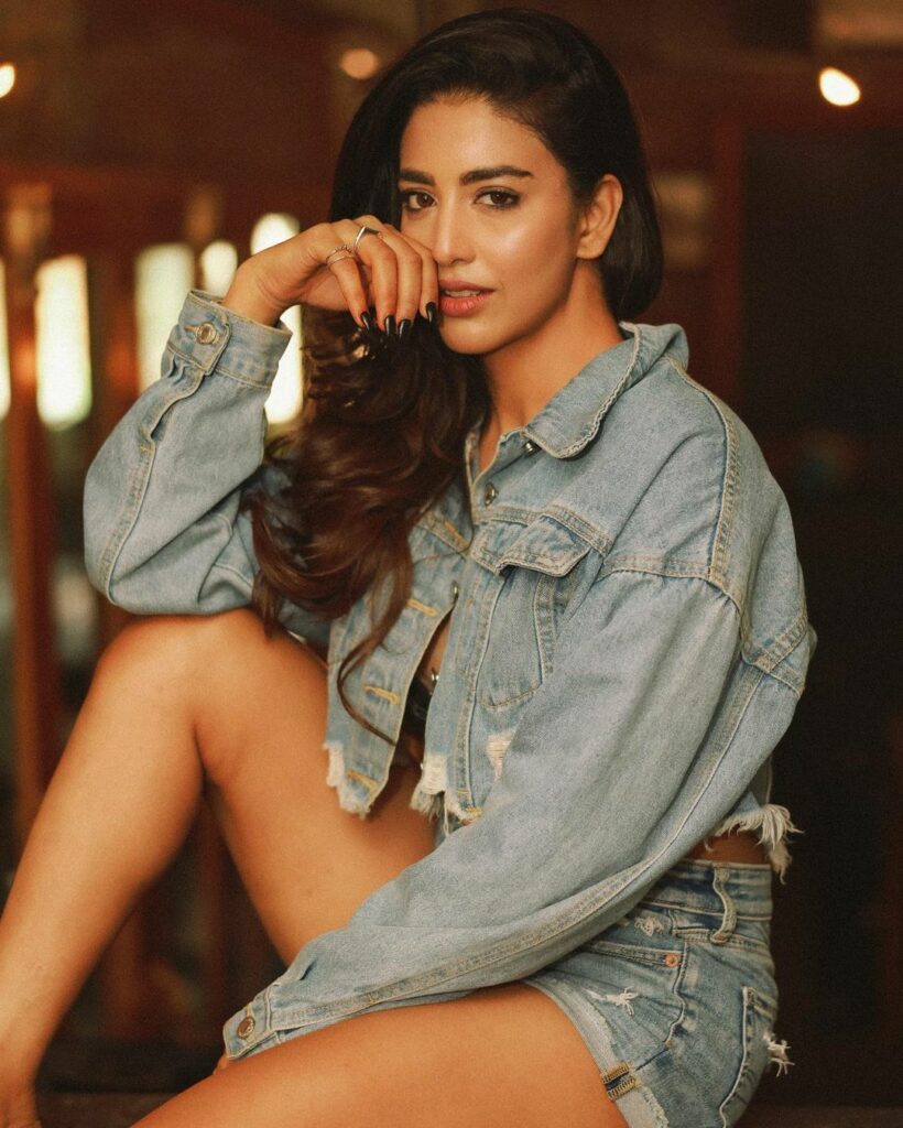 daksha is pictured standing in a high-rise denim pair of shorts and a traditional staple oversized denim jacket. With more than 50,000 likes on