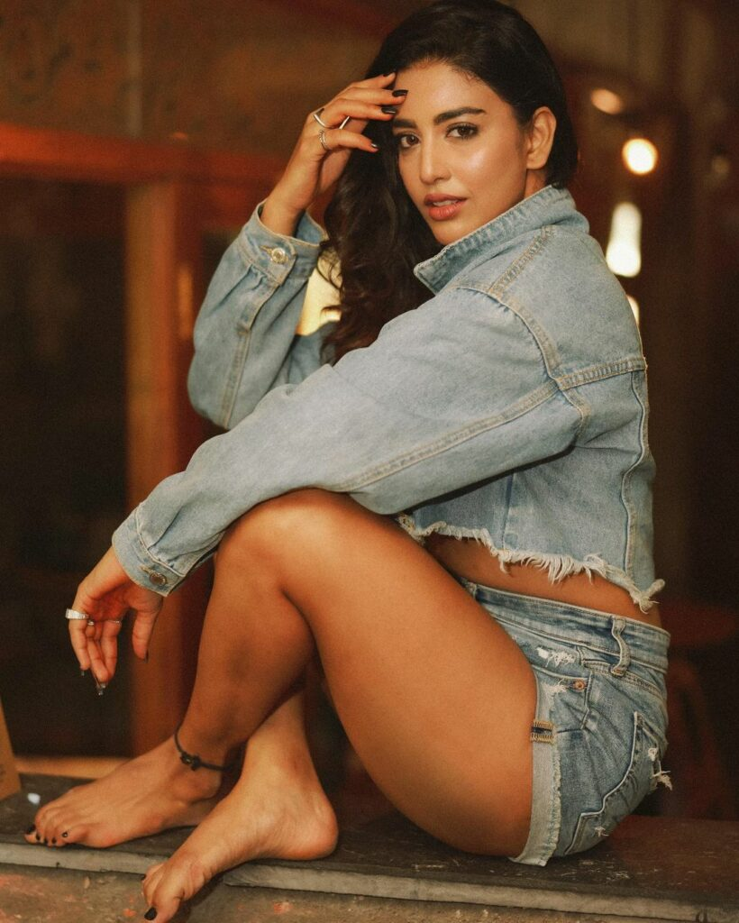daksha posed in vintage, baggy, destroyed-wash denim shorts and a jacket.