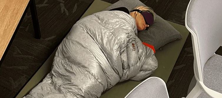 The image of his boss snuggled up in a sleeping bag on the workplace floor with a sleep mask pulled over her eyes was shared by twitter Spaces product manager Evan Jones. When posting the image to twitter, Evan Jones wrote, "When you need something from your boss at Elon." When retweeting the image, Esther Crawford wrote: "When your team is working nonstop to meet deadlines, sometimes you #SleepWhereYouWork."