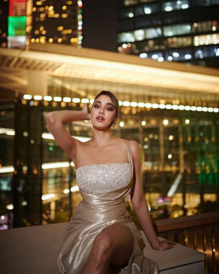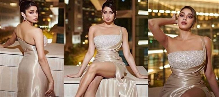beauty and seductive appeal is Janhvi Kapoor. She strikes viewers' senses in the most seductive way possible as she postures. She is emerging as a voluptuous actress with the capacity to seduce and rule the senses of many. She is the most sought-after actress and the heartthrob of millions. She recently devised a photo shoot in which she would dress in a body-hugging gown that sexily vents out her shoulder.