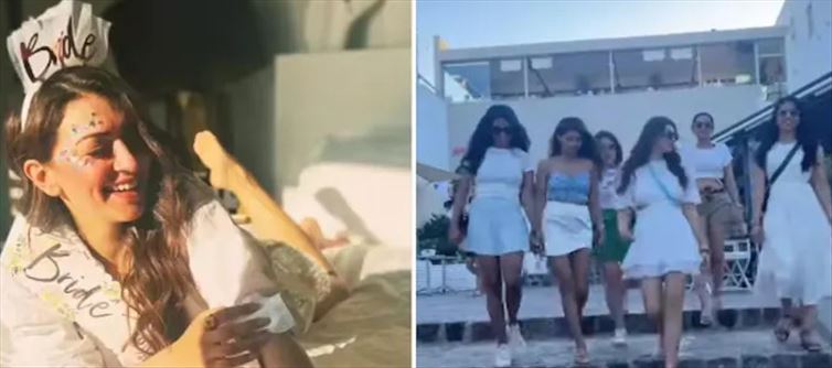 As Hansika exits her room laughing, the camera pans to her wearing a white top, a silver short skirt, and white shoes. She also has a "bride to be" band on her head and a sash around her waist. In the distance, the song Din Shagna Da by Phillauri can be heard. On the video, the phrase "greatest bachelorette