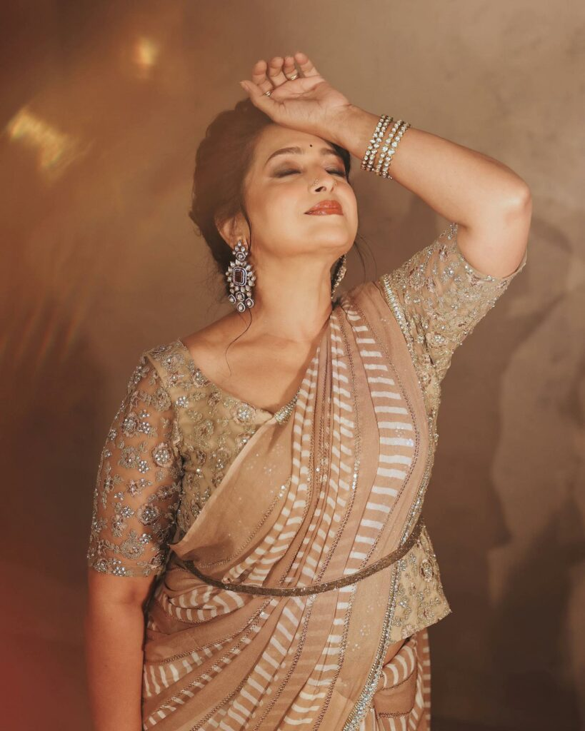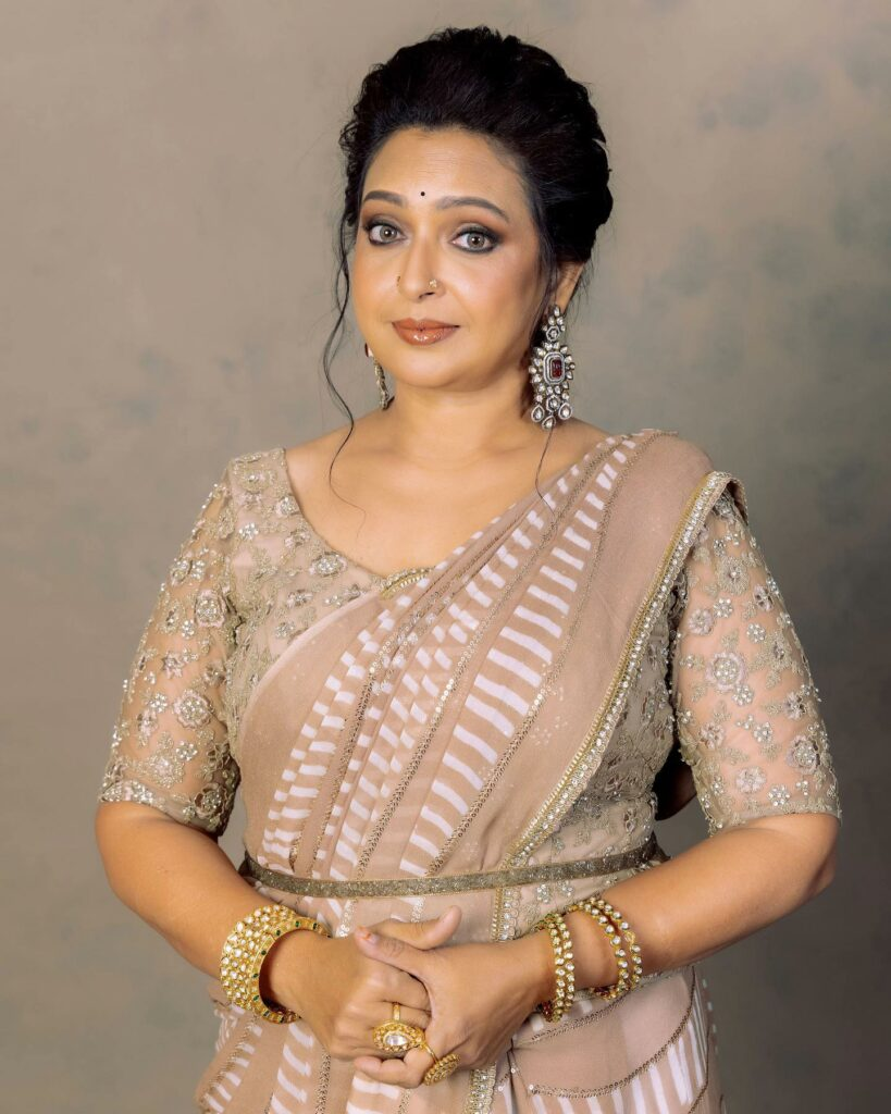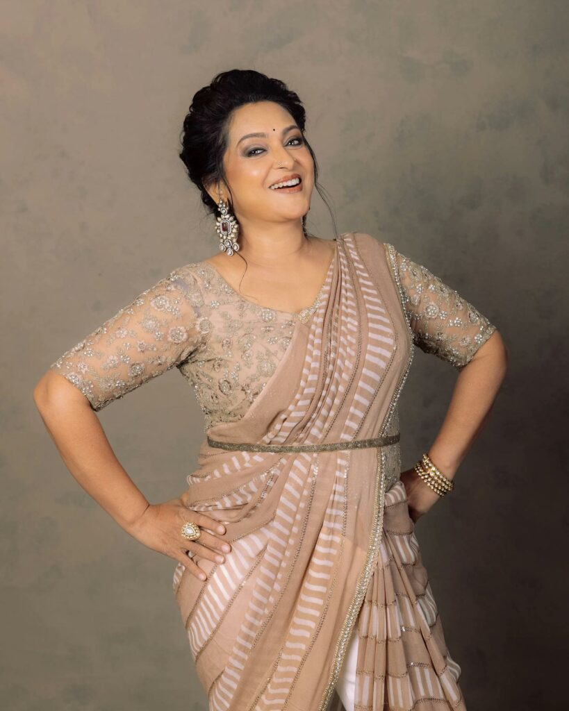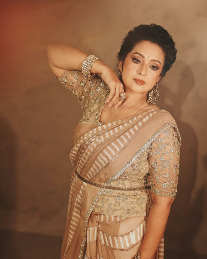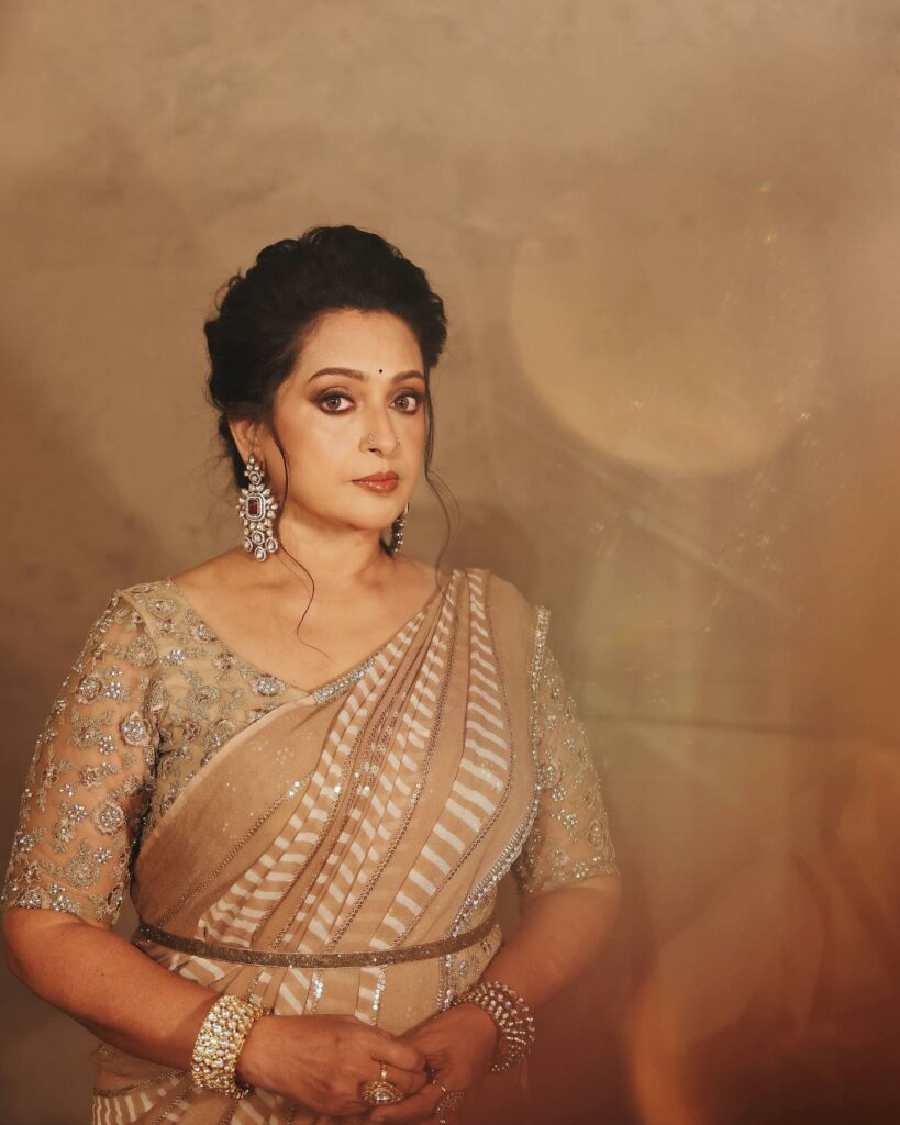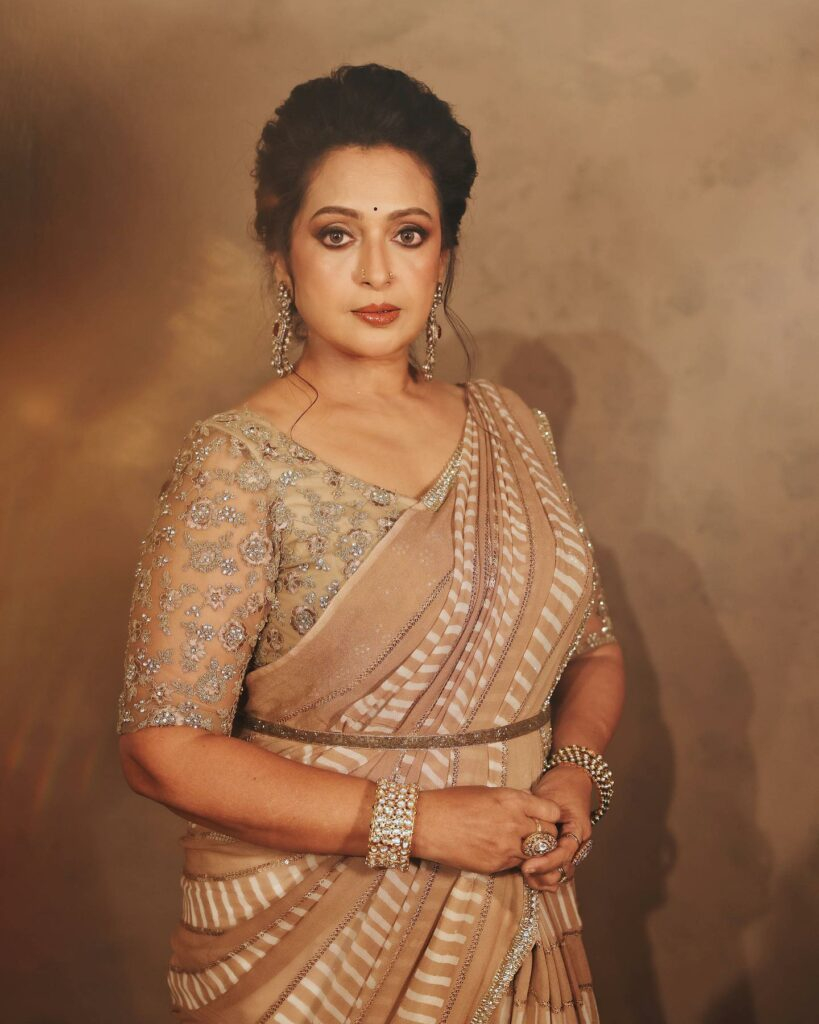 beautiful for her age of 55. She stunned everyone by going from a traditional saree to a modern one for the most recent picture session. She started her career in the 1980s and frequently played the sole leading lady in movies. She then became a character artist and played many heroes' and heroines' mothers.