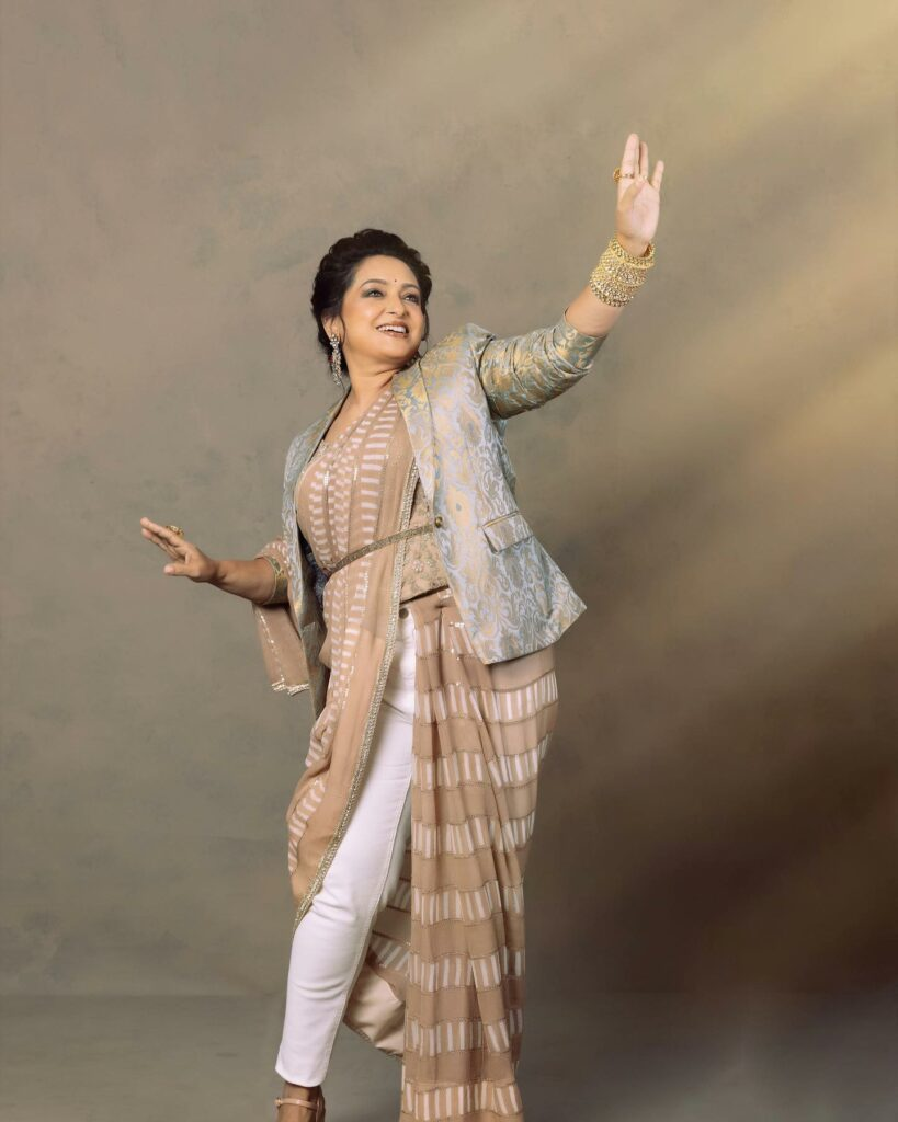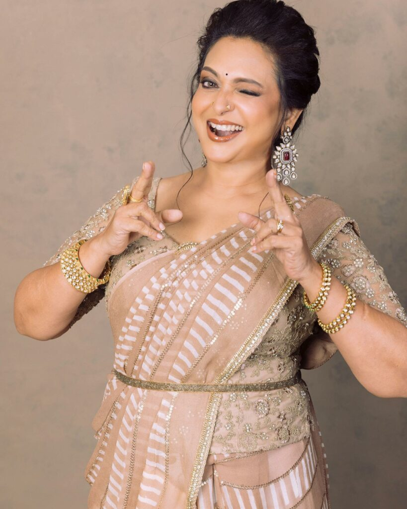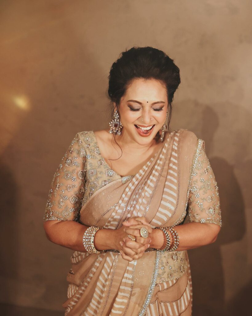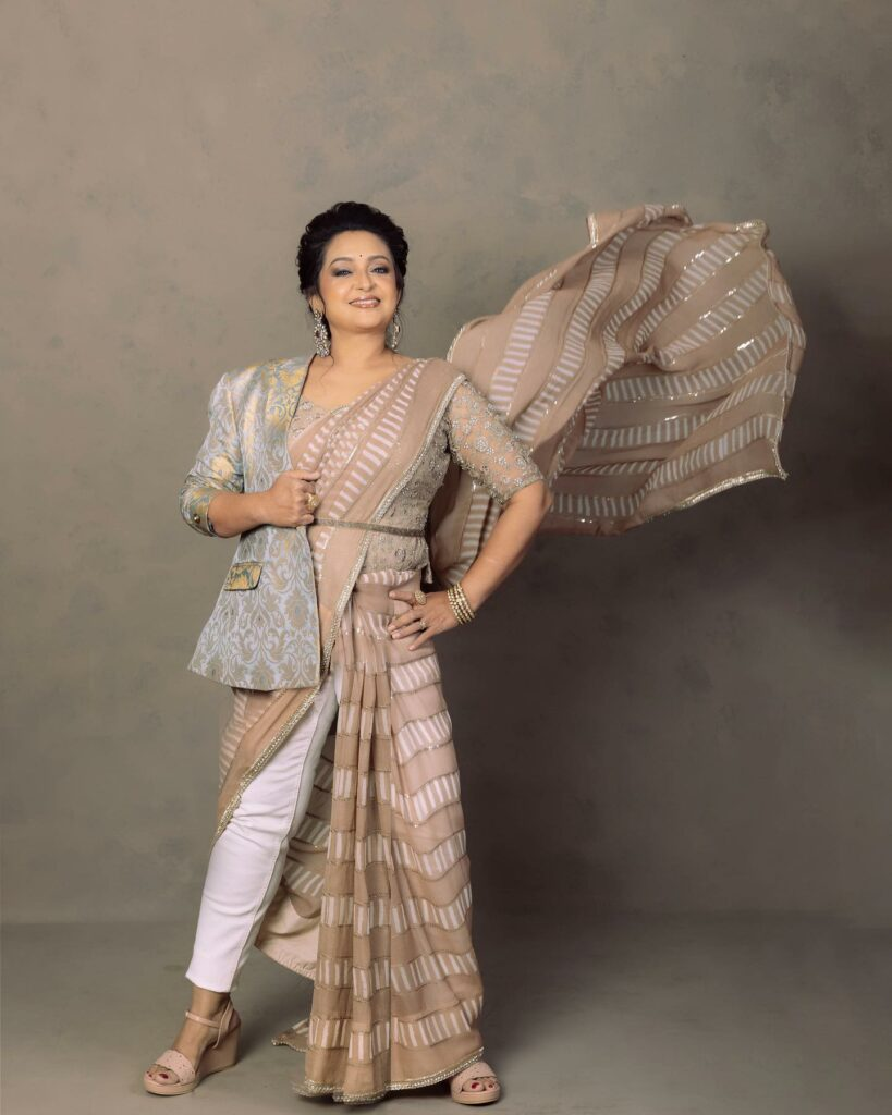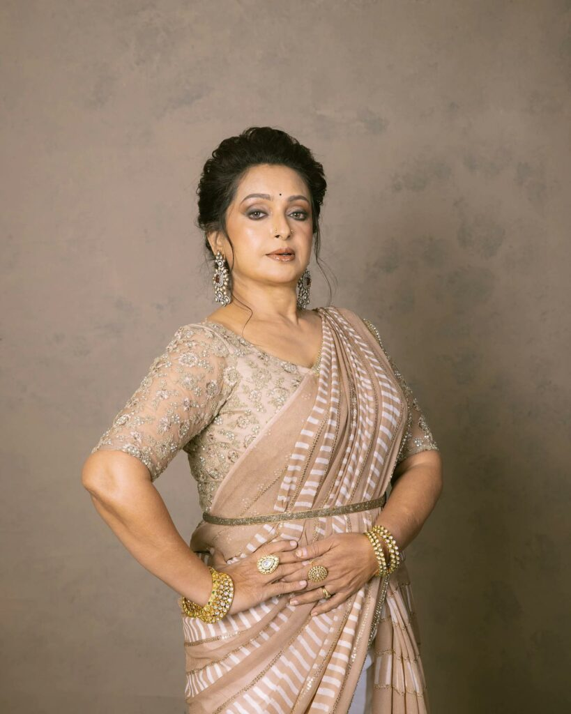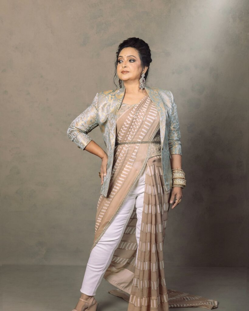 beautiful for her age of 55. She stunned everyone by going from a traditional saree to a modern one for the most recent picture session. She started her career in the 1980s and frequently played the sole leading lady in movies. She then became a character artist and played many heroes' and heroines' mothers.