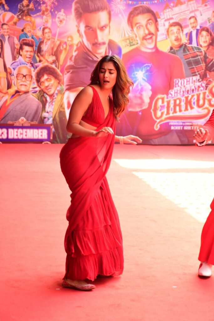One of the most beautiful actors in the nation, pooja hegde, can undoubtedly turn attention with her glitz. She was recently seen at the CirKus trailer presentation wearing a seductive red saree. She may be seen displaying her gorgeous physique in the video posted by celebrity photographer Viral Bhayani. social media users have been discussing the video and spreading reactions to it.